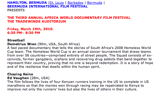 Here’s the post for Africa World Documentary Film Festival 2010. My film, ‘chasing KEINO‘, will screen at the Africa World Documentary Film Festival in Hamilton, Bermuda on Friday 19 March, Opening Night at 6:30 PM.