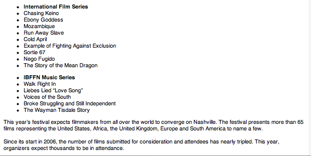 This year’s festival expects filmmakers from all over the world to converge on Nashville. The festival presents more than 65 films representing the United States, Africa, the United Kingdom, Europe and South America to name a few.