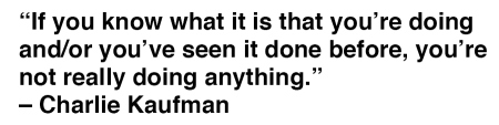 Charlie Kaufman is an LA screenwriter. He wrote ‘Being John Malkovich.’ I’d posted this quote before and had to go digging to find it. It’s been on my mind for the last couple days. Seems important; as we move into re-write ‘C’ of a script.